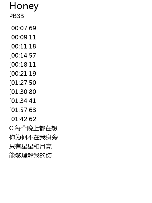 | [02:01.64][01:57.63][01:52.00][01:37.66][01:11.37][01:04.98][00:32.87] | 所以我会永远都叫你Honey |