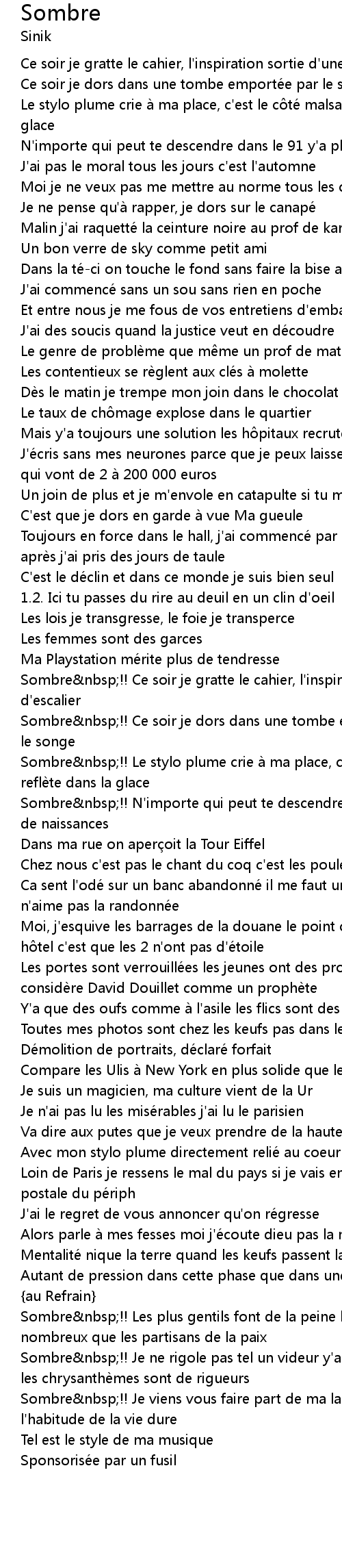 | Sombre nbsp!! Je viens vous faire part de ma lassitude t' inquiè te j' ai l' habitude de la vie dure | |