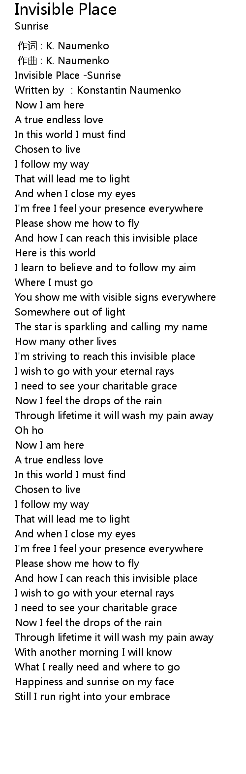 | [00:00.00] | Invisible Place Sunrise |