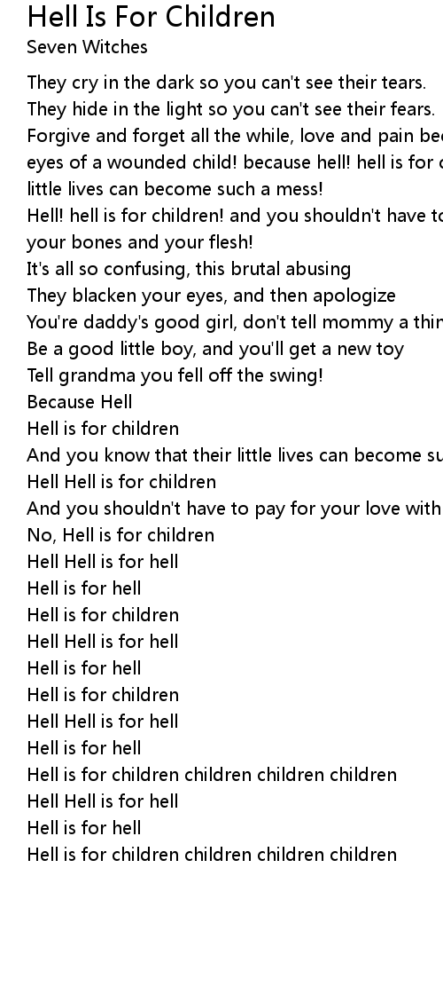 Forgive and forget all the while, love and pain become one in the same in the eyes of a wounded child! because hell! hell is for children! and you know their little lives can become such a mess! |
