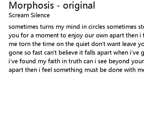 | sometimes turns my mind in circles sometimes stops my mind to breathe can i see you for a moment to enjoy our own apart then i feel something must be done with me torn the time on the quiet don't want leave you on the side a part of life is gone so fast can't believe it falls apart when i've gone my way in honour when i've found my faith in truth can i see beyond your contempt to enjoy our own apart then i feel something must be done with me |