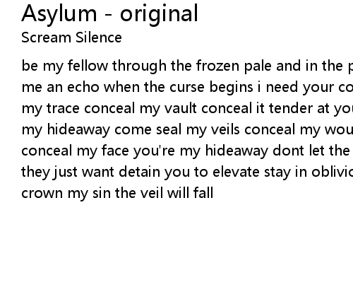 be my fellow through the frozen pale and in the purple tune my nightingale send me an echo when the curse begins i need your confidence to all my sins conceal my trace conceal my vault conceal it tender at your soul conceal my face you're my hideaway come seal my veils conceal my wound conceal the poems at your tongue conceal my face you're my hideaway dont let the crowd close to my consecrate they just want detain you to elevate stay in oblivion until i call and if i crown my sin the veil will fall |