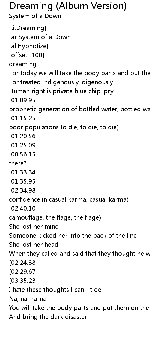 | [02:13.94][02:24.38][03:27.68][03:38.06] | Dreaming of screaming |