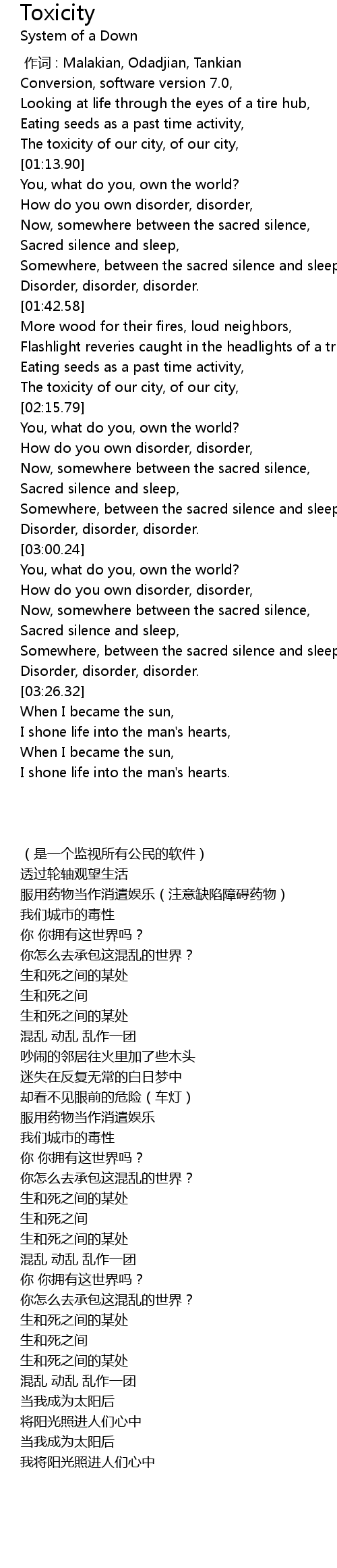 | [00:00.00] | 作词 : Malakian, Odadjian, Tankian |