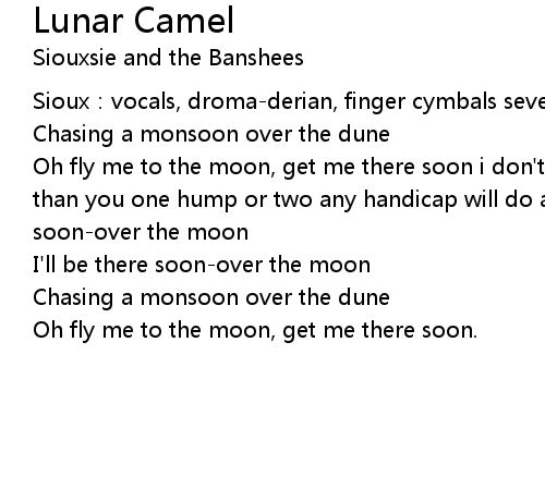 | Oh fly me to the moon, get me there soon i don't have to prove i'll last longer than you one hump or two any handicap will do against you i'll be there soon-over the moon | |