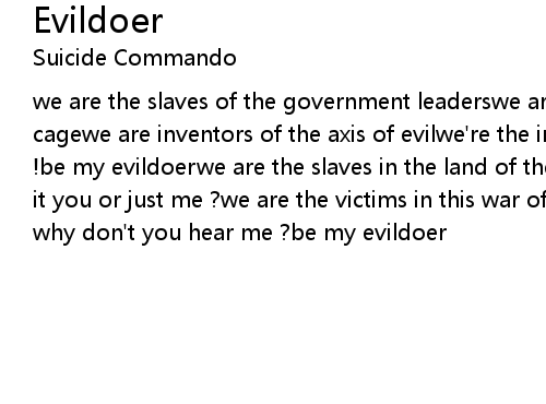 | we are the slaves of the government leaderswe are the free but we're locked in a cagewe are inventors of the axis of evilwe're the invaders, start the new raid !be my evildoerwe are the slaves in the land of the freewho's the aggressor, is it you or just me ?we are the victims in this war of the greedysuffer in hell, why don't you hear me ?be my evildoer |