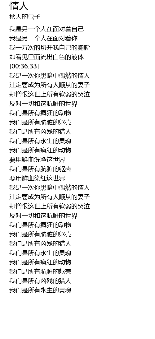 | [01:34.78] | 我们是所有肮脏的躯壳 |
