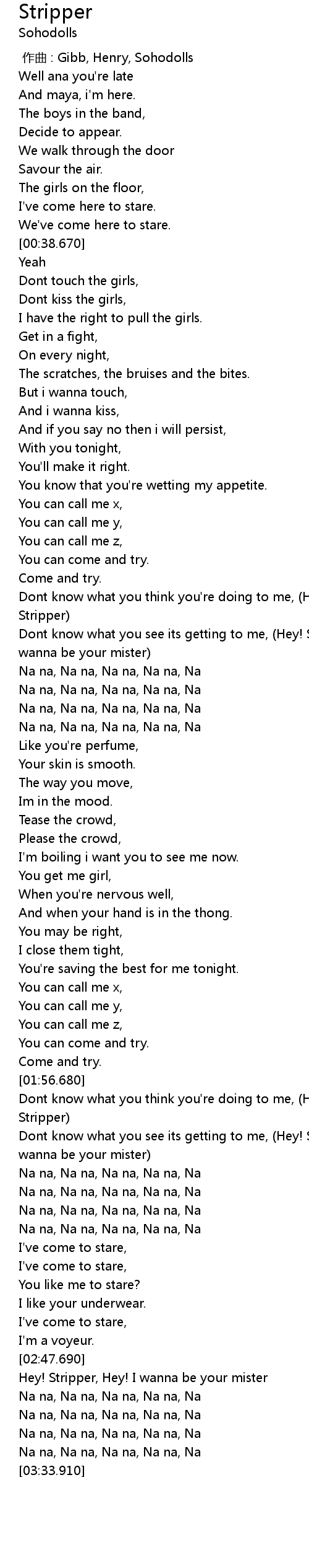 | [03:04.110] | Hey! Stripper, Hey! I wanna be your mister |
