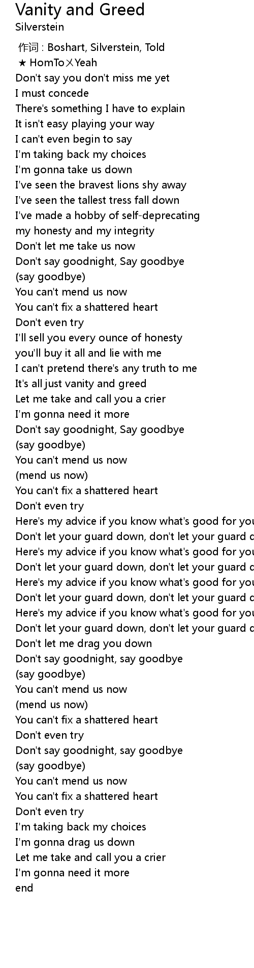 | [00:00.00] | 作词 : Boshart, Silverstein, Told |