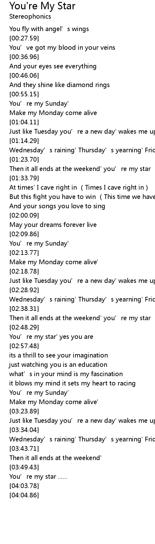 | [01:25.78] | Then it all ends at the weekend' you' re my star |