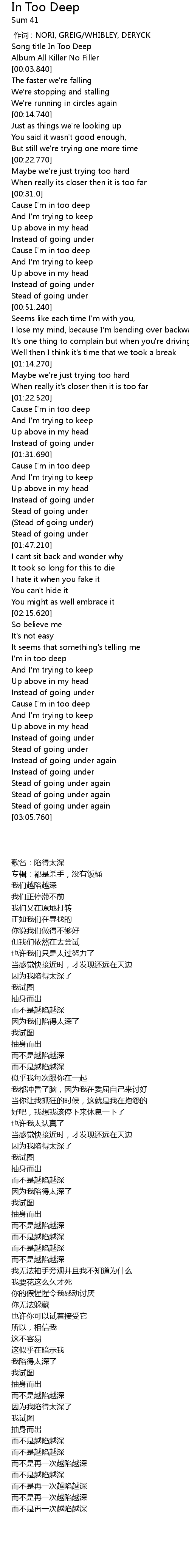 | [00:40.420] | Cause I' m in too deep |