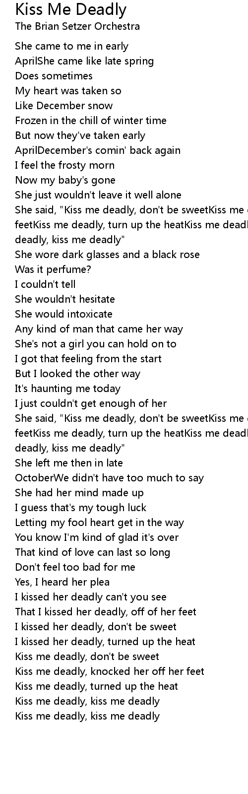 She said, "Kiss me deadly, don't be sweetKiss me deadly, knock me off my feetKiss me deadly, turn up the heatKiss me deadly, kiss me deadlyKiss me deadly, kiss me deadly" |