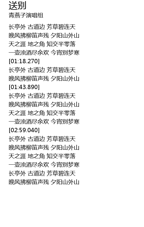 | [02:59.640] | 长亭外 古道边 芳草碧连天 |