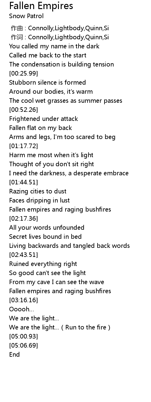 | [02:11.03] | Fallen empires and raging bushfires |
