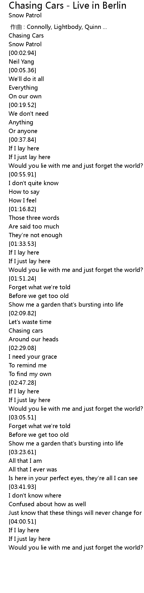 | [00:01.13] | Chasing Cars |
