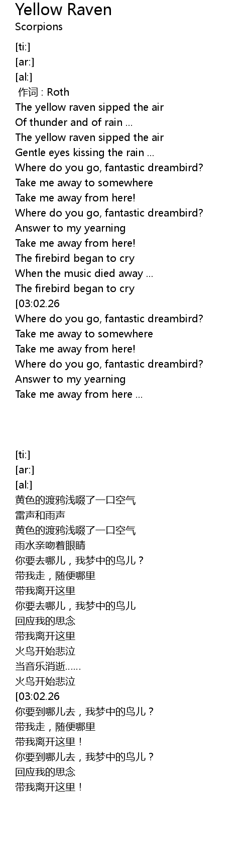 | [02:41.89] | The firebird began to cry |