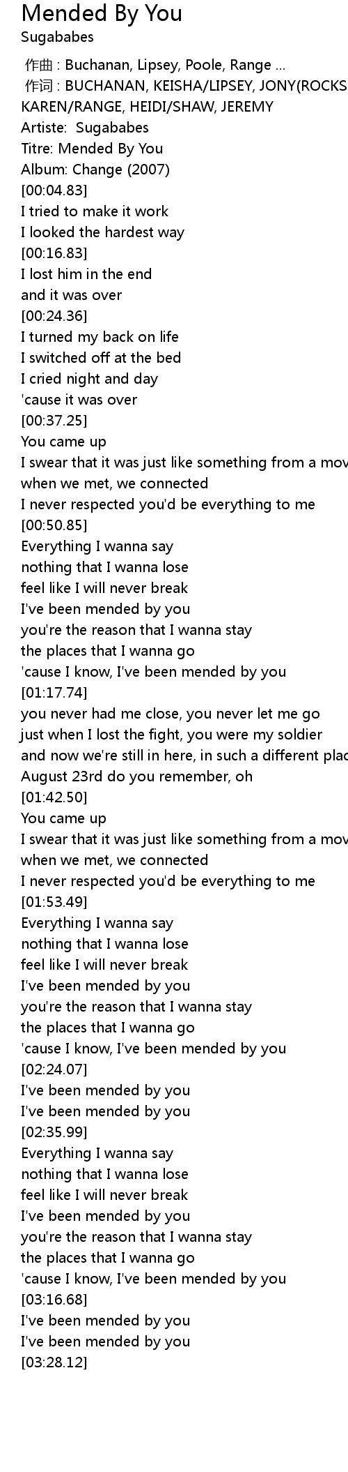 | [00:02.83] | Titre: Mended By You |