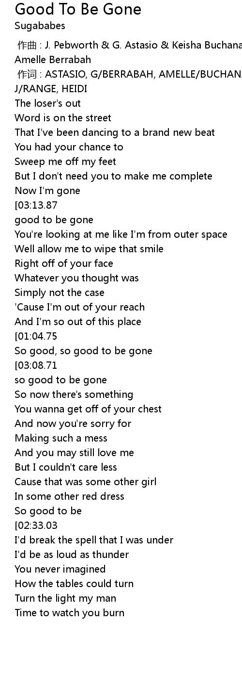 | [03:21.78][03:13.87][03:06.15][02:58.01][02:29.63][02:22.05][02:14.00][02:06.24][01:56.43][01:25.53][01:18.08][00:42.80] | So good to be gone |