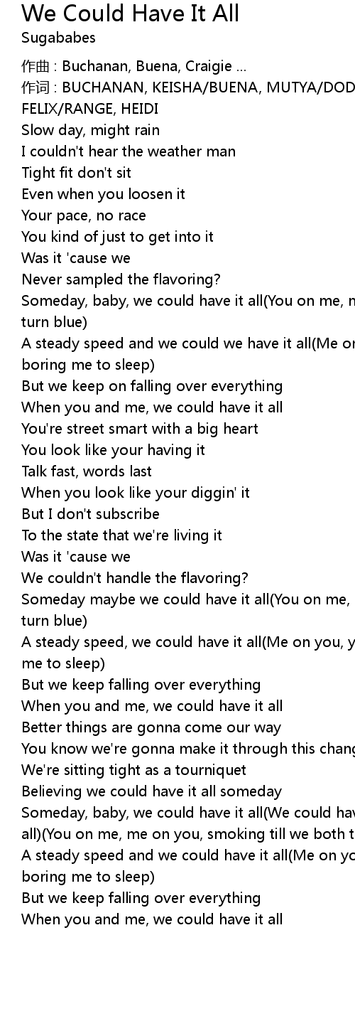 | Someday, baby, we could have it all We could have it all, we could have it all You on me, me on you, smoking till we both turn blue | |