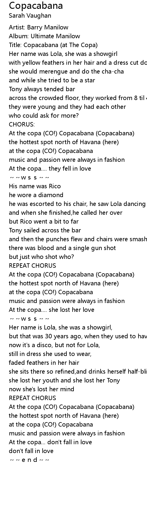 | [00:21.80] | Title: Copacabana (at The Copa) |