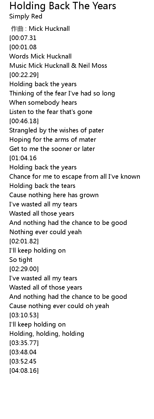 | [00:13.03] | Music Mick Hucknall Neil Moss |