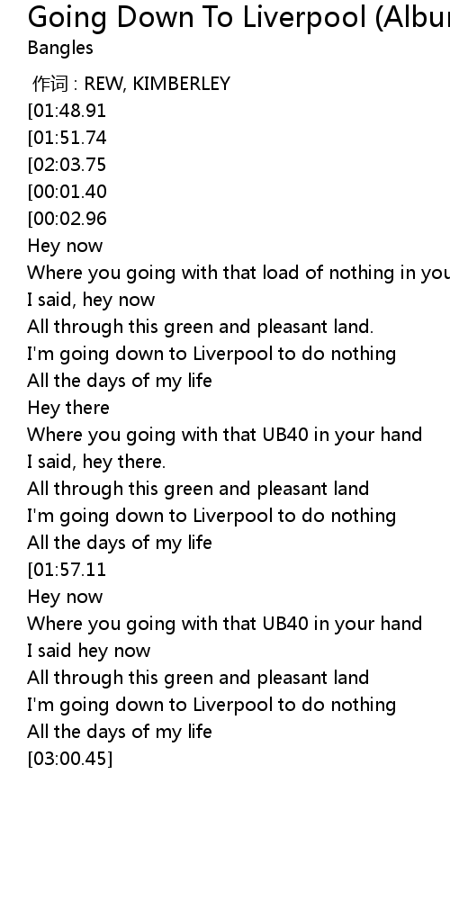 | [03:10.94][01:51.74][00:04.67] | The Bangles - Going Down To Liverpool |