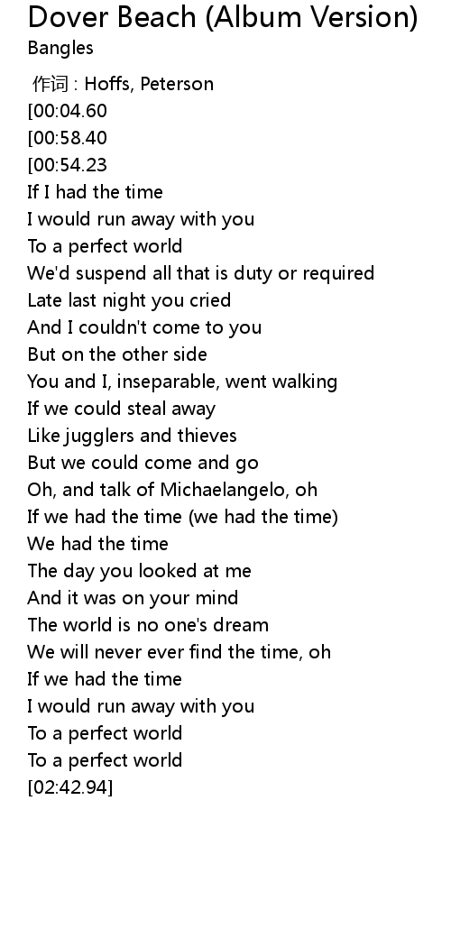 | [00:01.95][00:58.40] | The Bangles Dover Beach |