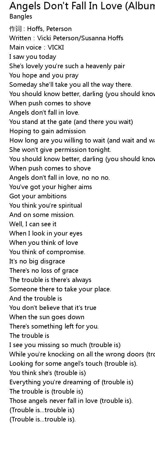 | Those angels never fall in love trouble is. | |