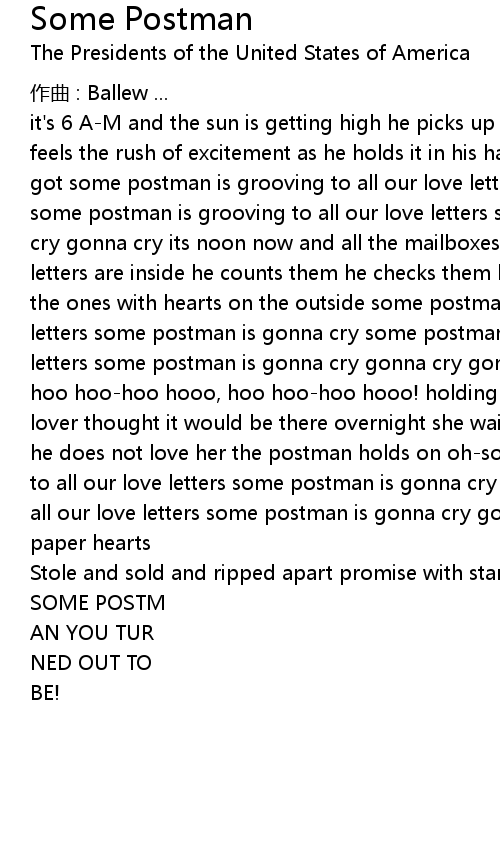 | it's 6 A-M and the sun is getting high he picks up the mail from the slot he feels the rush of excitement as he holds it in his hand another love note no one got some postman is grooving to all our love letters some postman is gonna cry some postman is grooving to all our love letters some postman is gonna cry gonna cry gonna cry its noon now and all the mailboxes have been emptied and all the letters are inside he counts them he checks them he looks for clues and finds the ones with hearts on the outside some postman is grooving to all our love letters some postman is gonna cry some postman is grooving to all our love letters some postman is gonna cry gonna cry gonna cry gonna cry, yah yah! 1993! hoo hoo-hoo hooo, hoo hoo-hoo hooo! holding onto package meant for a distant lover thought it would be there overnight she waits and she cries and she thinks he does not love her the postman holds on oh-so tight some postman is grooving to all our love letters some postman is gonna cry some postman is grooving to all our love letters some postman is gonna cry gonna cry, yeah! you crushed paper hearts | |