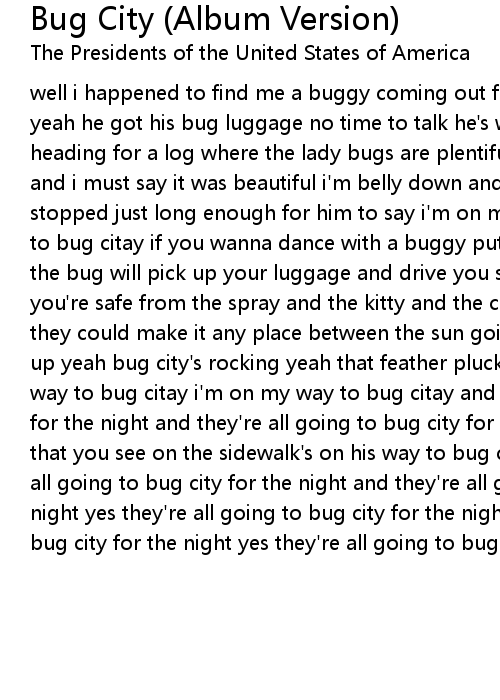 well i happened to find me a buggy coming out from under a rock in the grass yeah he got his bug luggage no time to talk he's walkin' fast yeah said he's heading for a log where the lady bugs are plentiful he showed me some brochures and i must say it was beautiful i'm belly down and bendin' back the blades bug stopped just long enough for him to say i'm on my way to bug citay i'm on my way to bug citay if you wanna dance with a buggy put all six feet on the ground yeah the bug will pick up your luggage and drive you straight into town yep where you're safe from the spray and the kitty and the chase if bugs can make it there they could make it any place between the sun going going down and the sun coming up yeah bug city's rocking yeah that feather pluckin' log is lit up i'm on my way to bug citay i'm on my way to bug citay and they're all going to bug city for the night and they're all going to bug city for the night every single bug that you see on the sidewalk's on his way to bug city for the night and they're all going to bug city for the night and they're all going to bug city for the night yes they're all going to bug city for the night and they're all going to bug city for the night yes they're all going to bug city for the night |