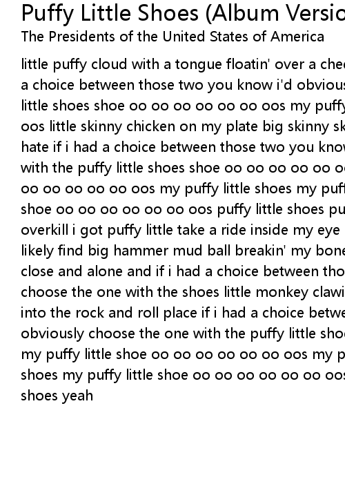 little puffy cloud with a tongue floatin' over a cheese puff rug a lug if i had a choice between those two you know i'd obviously choose the one with the puffy little shoes shoe oo oo oo oo oo oo oos my puffy little shoe oo oo oo oo oo oo oos little skinny chicken on my plate big skinny skinhead he's up to here with hate if i had a choice between those two you know i'd obviously choose the one with the puffy little shoes shoe oo oo oo oo oo oo oos my puffy little shoe oo oo oo oo oo oo oos my puffy little shoes my puffy little shoes my puffy little shoe oo oo oo oo oo oo oos puffy little shoes puffy little shoes yeah urge overkill i got puffy little take a ride inside my eye and this is what you will likely find big hammer mud ball breakin' my bones soft shoulder salamander's up close and alone and if i had a choice between those two i'd absolutely have to choose the one with the shoes little monkey clawin' at my face and people pack into the rock and roll place if i had a choice between those two you know i'd obviously choose the one with the puffy little shoes shoe oo oo oo oo oo oo oos my puffy little shoe oo oo oo oo oo oo oos my puffy little shoes my puffy little shoes my puffy little shoe oo oo oo oo oo oo oos puffy little shoes puffy little shoes yeah |