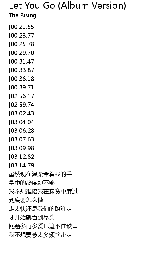 | [03:37.94][02:56.17][01:30.46][00:44.96] | Let You Go Let You Go |
