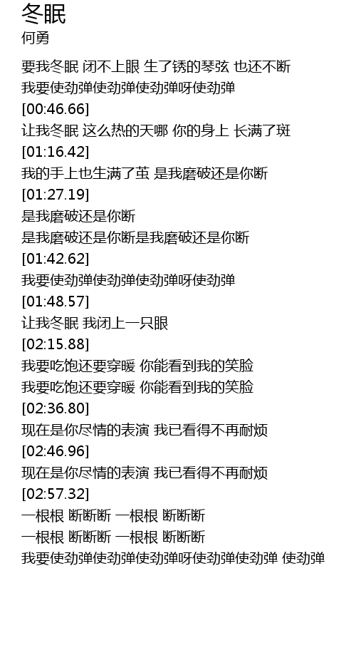 | [00:31.02] | 要我冬眠 闭不上眼 生了锈的琴弦 也还不断 |
