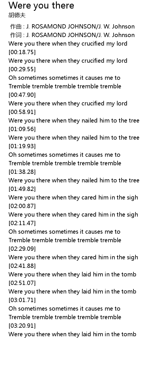 | [02:53.22] | Were you there when they laid him in the tomb |