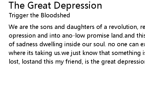 | We are the sons and daughters of a revolution, revolutionaries walking us out of opression and into ano-low promise land.and this is leaves us with a great sense of sadness dwelling inside our soul. no one can explain whereits' coming from or where its taking us.we just know that something is lost, but somehow we are lost, lostand this my friend, is the great depression |