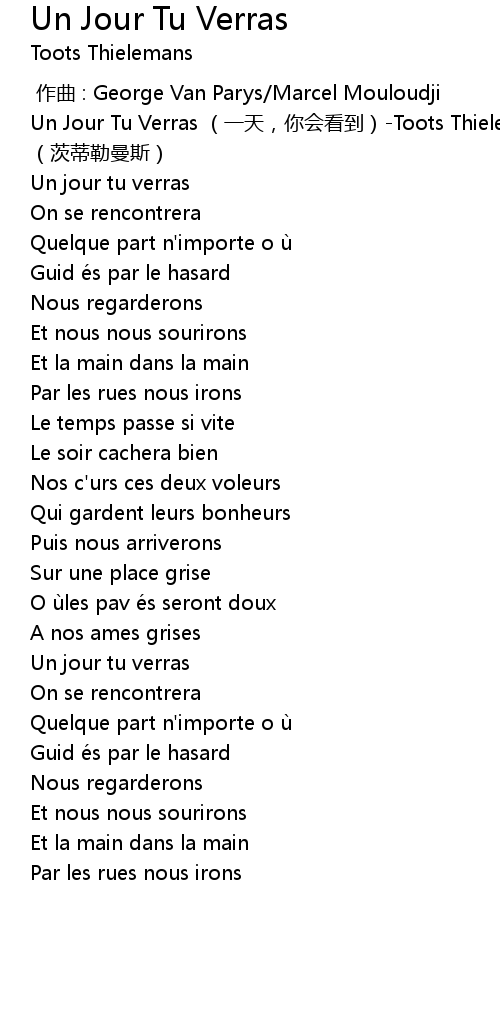 | [00:00.00] | Un Jour Tu Verras yì tiān, nǐ huì kàn dào Toots Thielemans cí dì lēi màn sī |