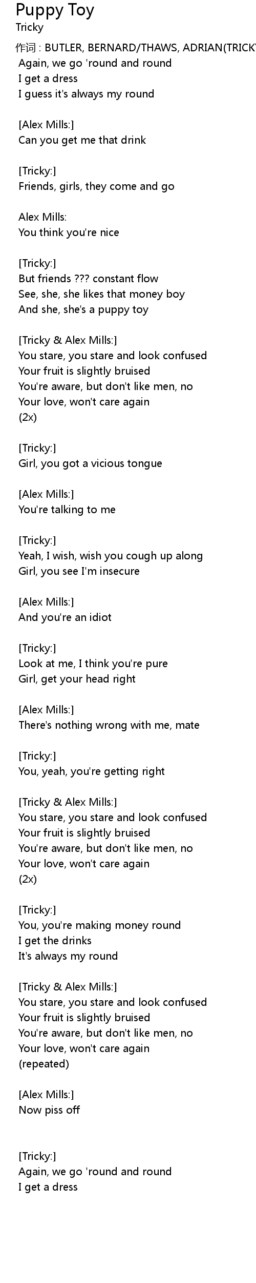 | 作词 : BUTLER, BERNARD/THAWS, ADRIAN(TRICKY) | |