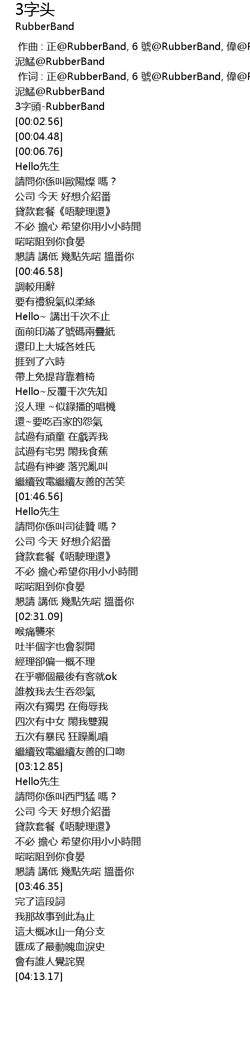| [00:00.24] | 作词 : 正@RubberBand, 6 號@RubberBand, 偉@RubberBand, 泥鯭@RubberBand |
