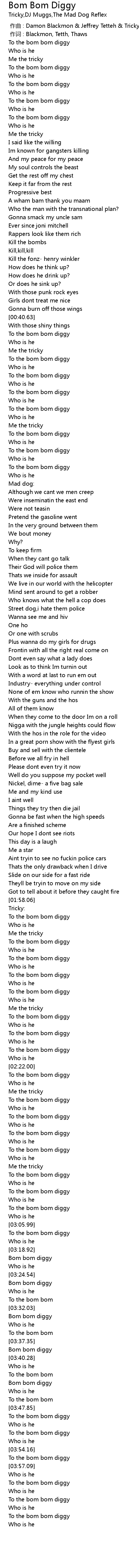| [03:00.13] | To the bom bom diggy |