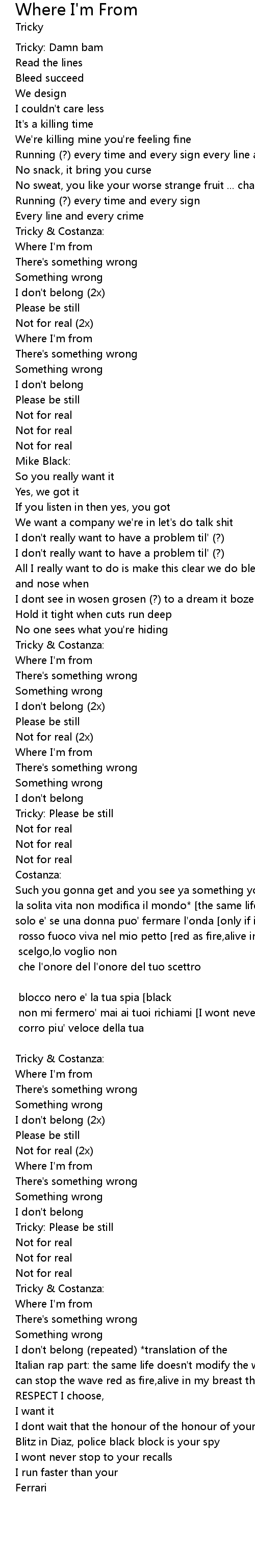 Such you gonna get and you see ya something you dont wanna you dont wanna see ya la solita vita non modifica il mondo* [the same life doesn't modify the world] solo e' se una donna puo' fermare l'onda [only if is a woman she can stop the wave] rosso fuoco viva nel mio petto [red as fire,alive in my breast] solo una parola c'e' : rispetto [there's only a word : RESPECT] scelgo,lo voglio non aspetto [I choose,I want it I dont wait] che l'onore del l'onore del tuo scettro [that the honour of the honour of your sceptre] |