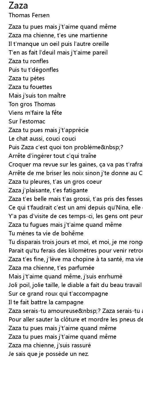 | Zaza tu fugues mais j' t' aime quand m me | |