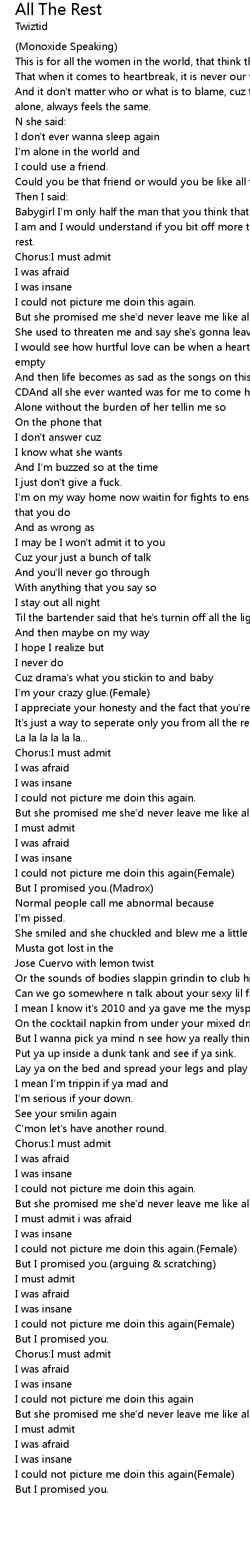 But she promised me she'd never leave me like all the rest.(Monoxide) |