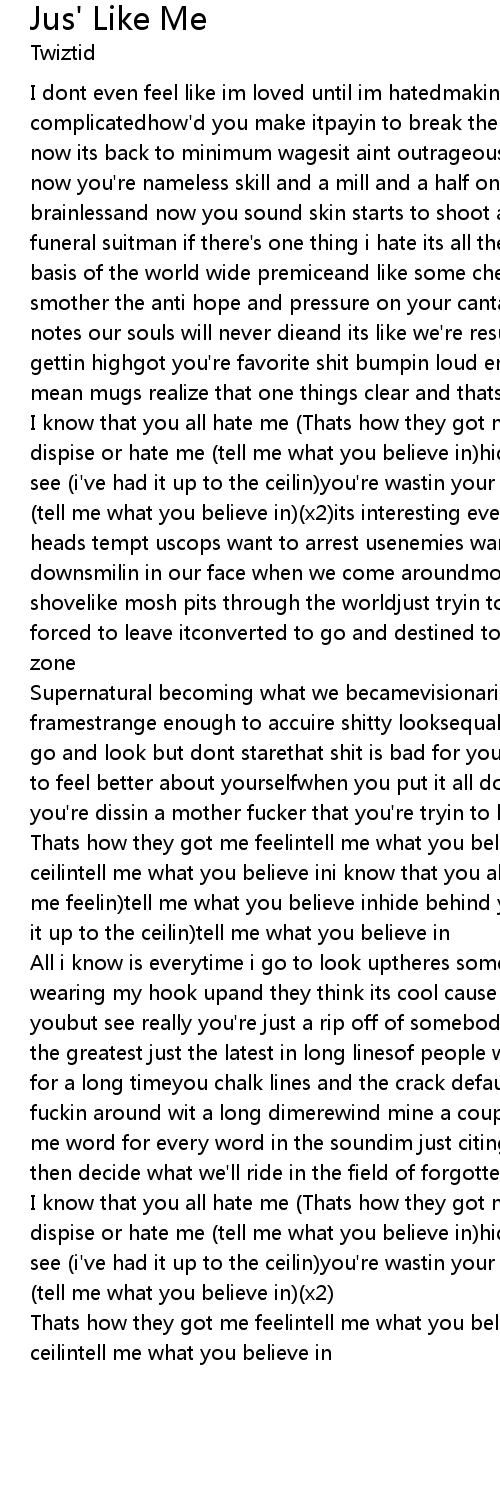 I know that you all hate me (Thats how they got me feelin)you dont really dispise or hate me (tell me what you believe in)hide behind your facade but i see (i've had it up to the ceilin)you're wastin your time hatin me just like me (tell me what you believe in)(x2) |