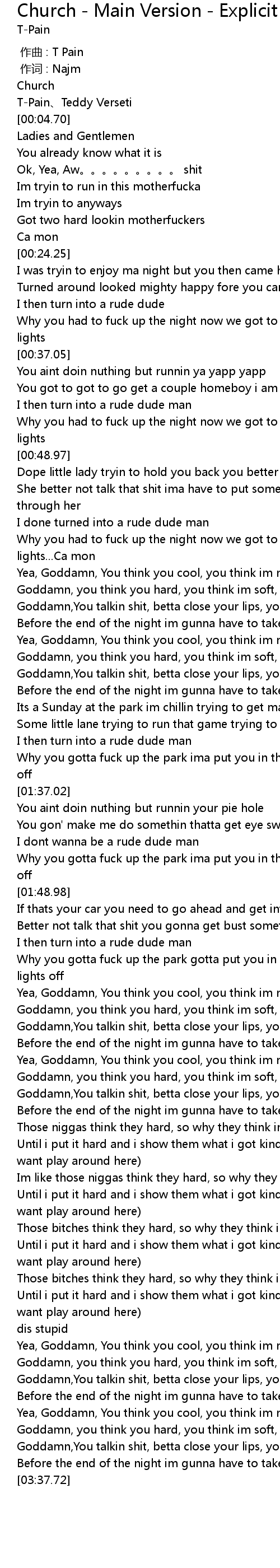 | [02:22.34] | Before the end of the night im gunna have to take your ass to church |