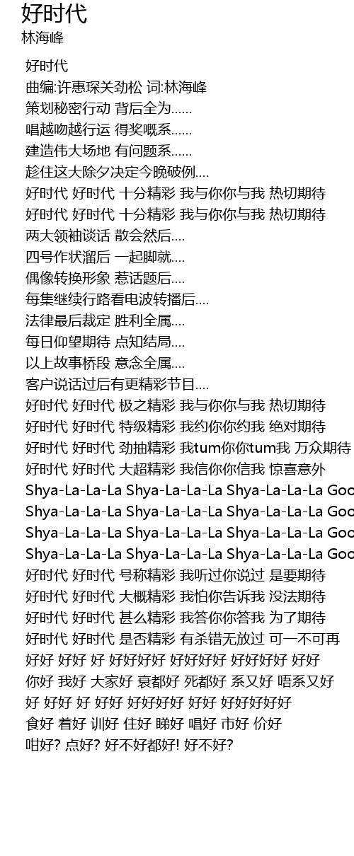 | [03:01.03] | 好时代 好时代 特级精彩 我约你你约我 绝对期待 |