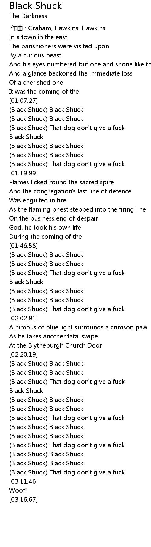 | [01:17.33] | Black Shuck That dog don' t give a fuck |