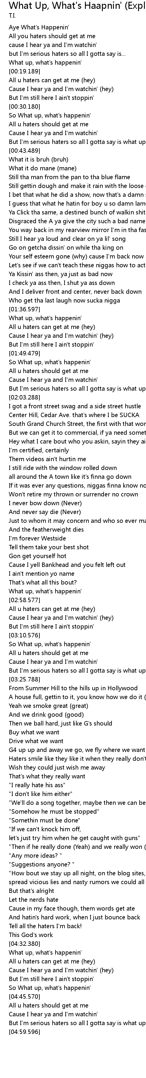 | [04:55.168] | But I' m serious haters so all I gotta say is what up.. |