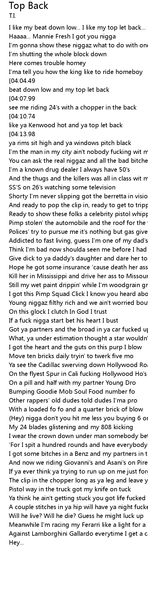 | [04:22.82][04:10.74][03:22.03][03:10.49][02:10.17][01:57.76][00:57.83][00:46.29] | Ya like ya Kenwood hot and ya top let back |