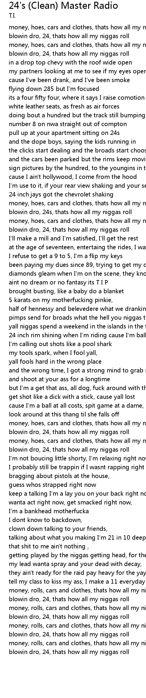 | money, hoes, cars and clothes, thats how all my niggas know | |
