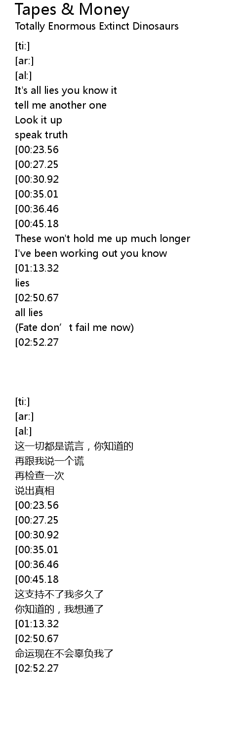 | [02:51.78][02:50.67][02:49.71][02:48.71][02:47.84][02:46.74][02:43.86][02:42.91][02:40.89][02:41.90] | It' s all lies |